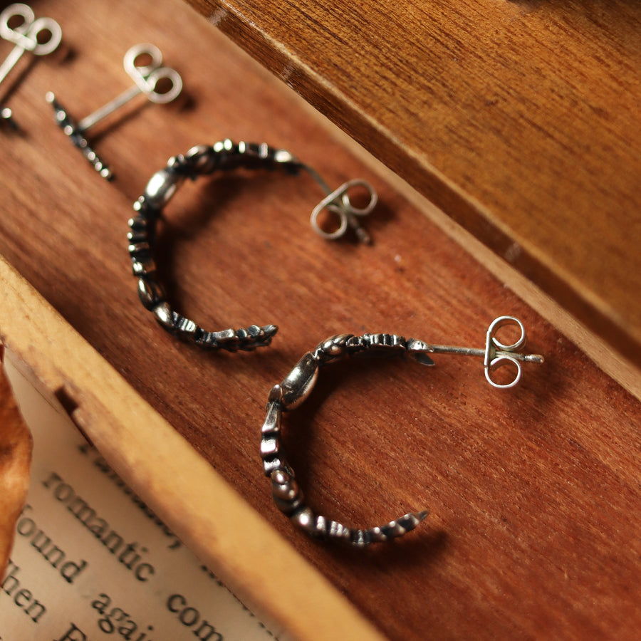 Our Autumn Is Calling Hoops are back with a revamp and this time in solid sterling silver with a witchy crescent moon addition. Our new favourite fall inspired hoops feature pumpkins, a crescent moon, maple and oak emblems. Standard butterfly back fastening.