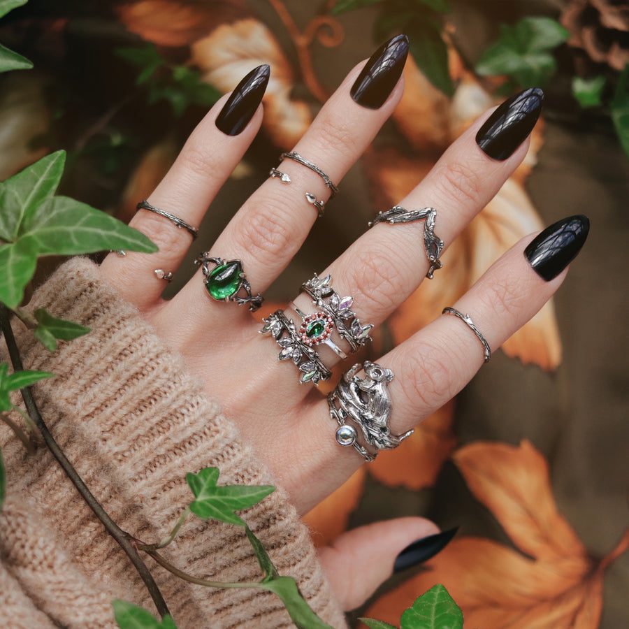 If you've been searching for the perfect vintage inspired boho gothic jewel, meet our sterling silver Rosmerta Ring. Featuring a forest green cubic zirconia centre surrounded by dainty blood red stones and set into a delicate band, she is a true Dixi enchantress.