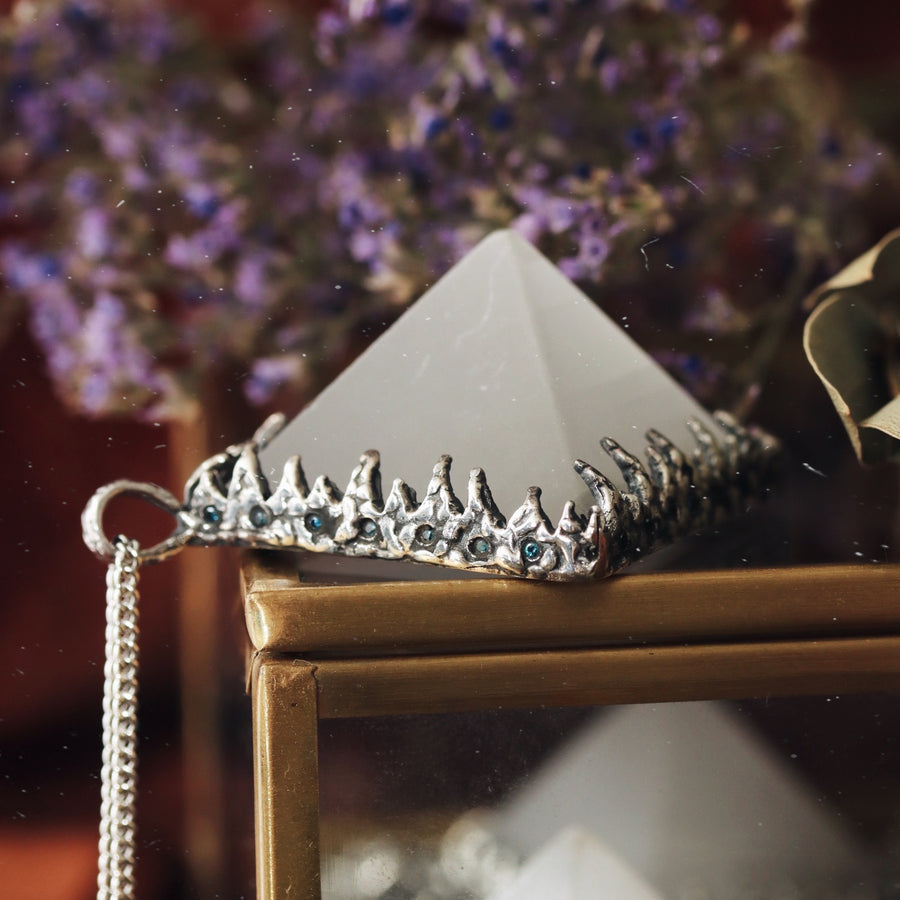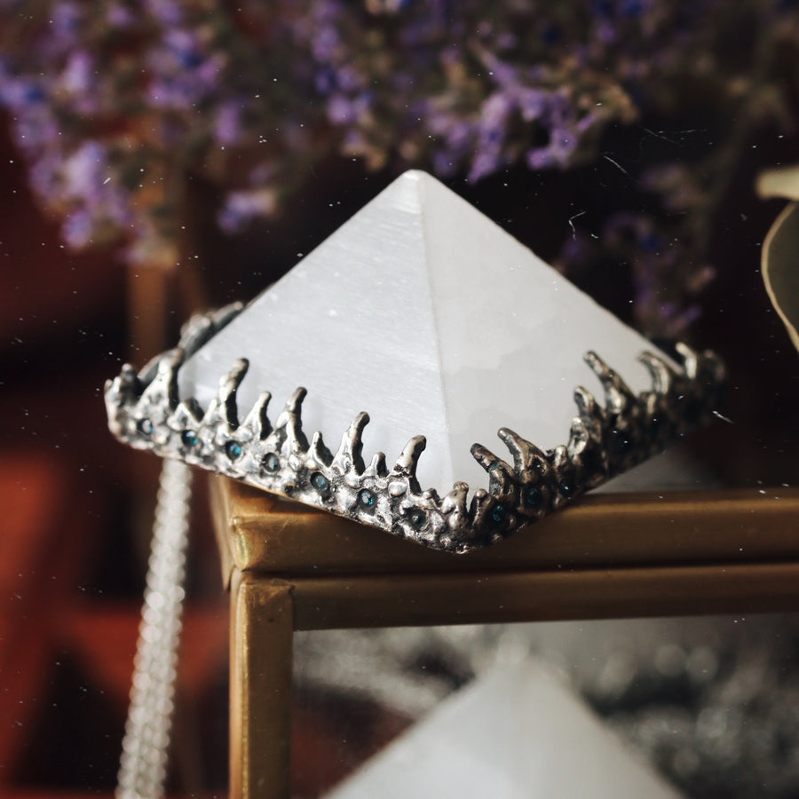 Meet the Shop Dixi unique Sacred Selenite Crystal Pyramid Necklace, featuring a mystical selenite stone centre encased in sterling silver icicle detail and blue gemstones imitating the night sky.