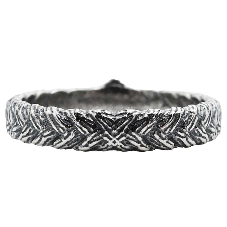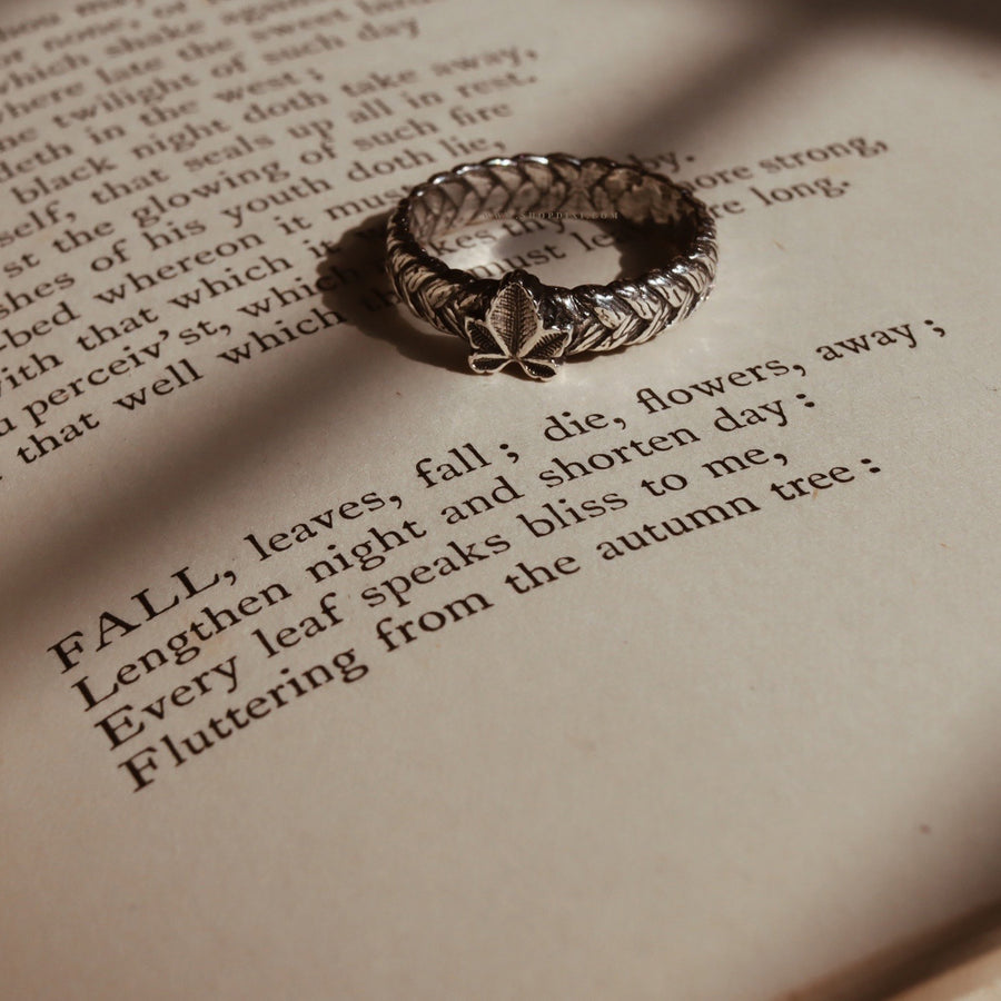 Uniting the beloved organic texture of Dixi rings with our deep admiration for all things Victorian, this ring draws inspiration from the traditional 19th-century mourning rings. Its braided band symbolizes intertwining strands of sentiment, allowing you to wear it in memory of a cherished individual or simply as an addition to your aesthetic jewellery collection. Featuring a delicate single Wild Ivy leaf entwined with braid band detailing, she is a gentle soul for lovers of daintier gothic jewellery.