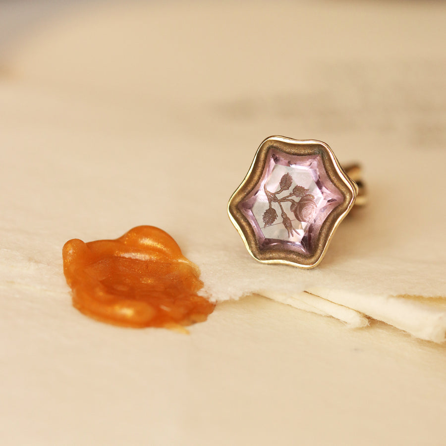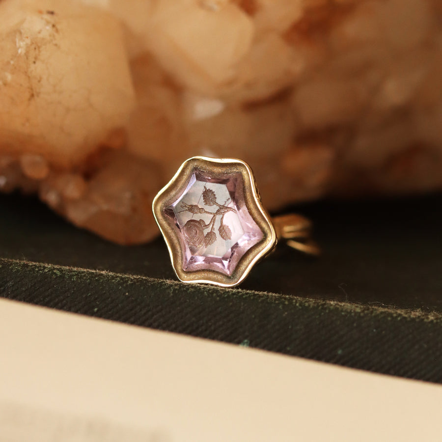 Beautiful pendant featuring amethyst engraved rose and leaf / acorn side detail.