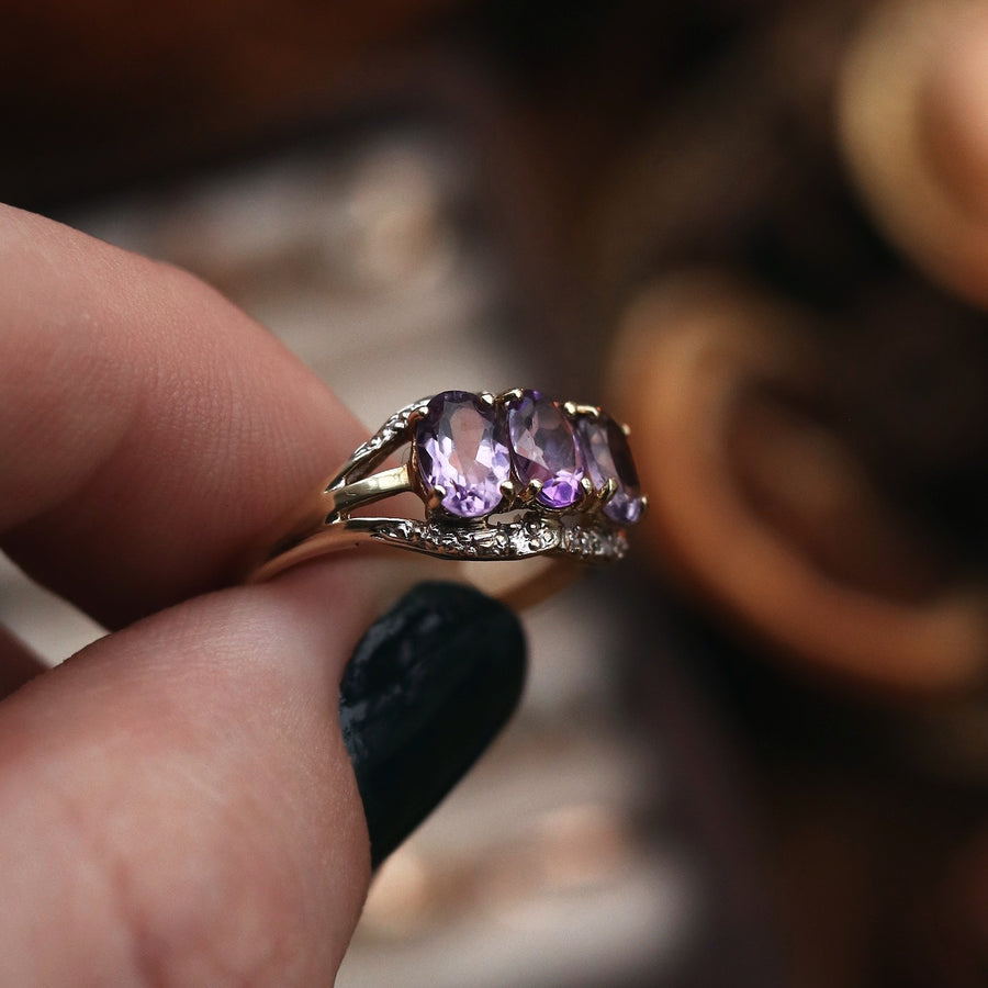 Magical unique 9ct Gold vintage ring with a trio of iridescent amethyst stones.