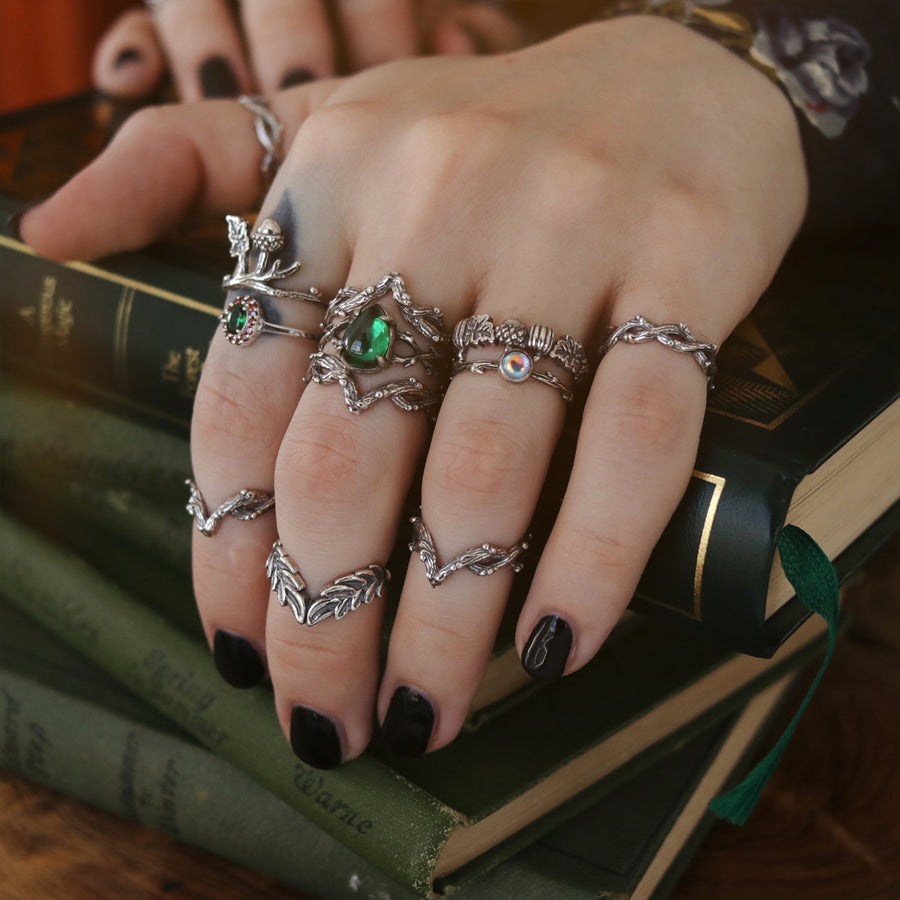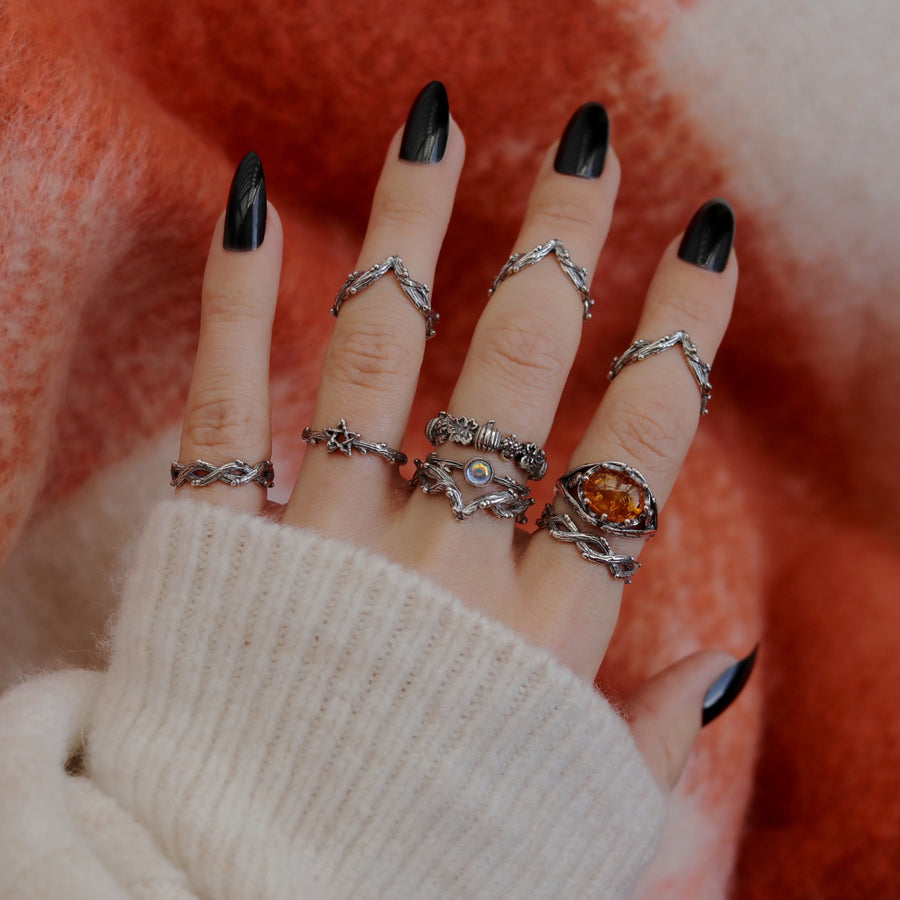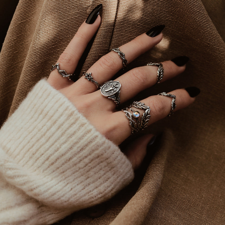 Meet the 'Wolf Moon' sterling silver thorn and mystic night sky inspired ring. Featuring an iridescent cubic zirconia centre nestled in an antiqued branch detailed silver band, she's the perfect stacking ring for your boho jewelry collection.
