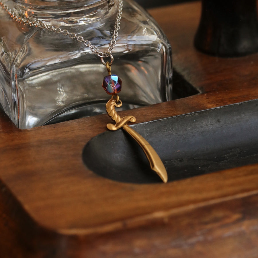Affordable witchy necklace featuring raw brass sword and mystic stone. These do have an antiqued look to them as they are vintage raw brass stock.