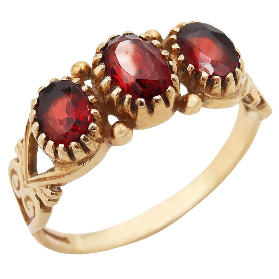 Magical unique 9ct Gold ring featuring a trio of iridescent garnet stones and delicate detail.
