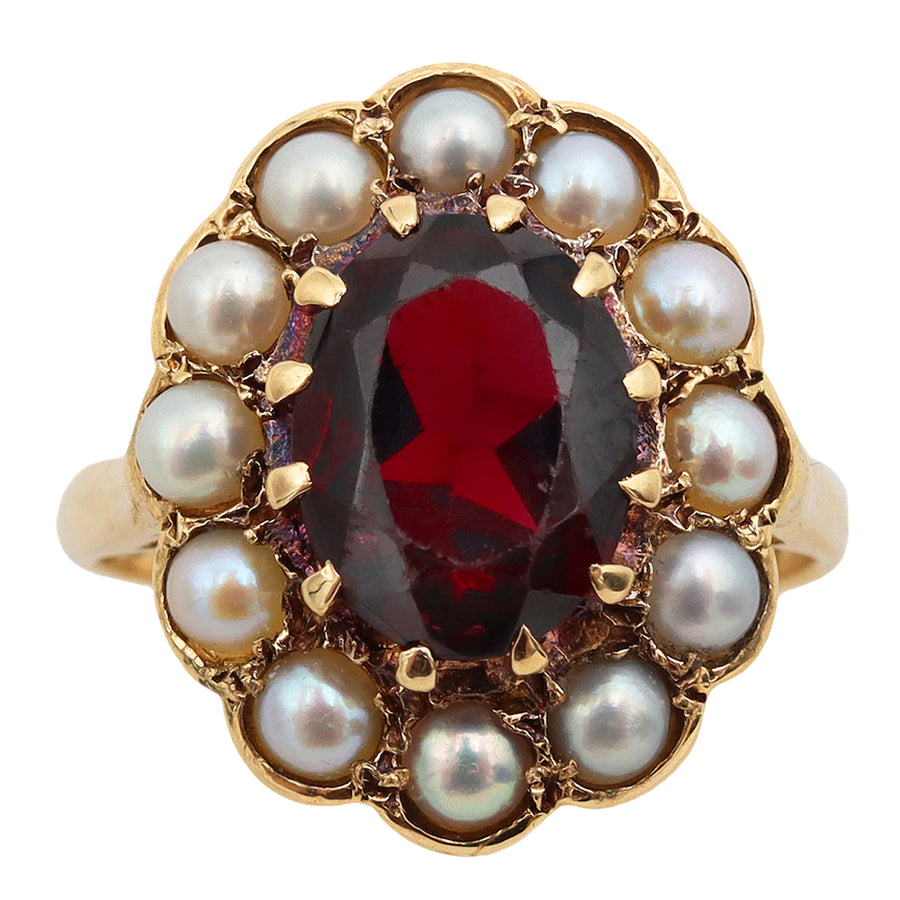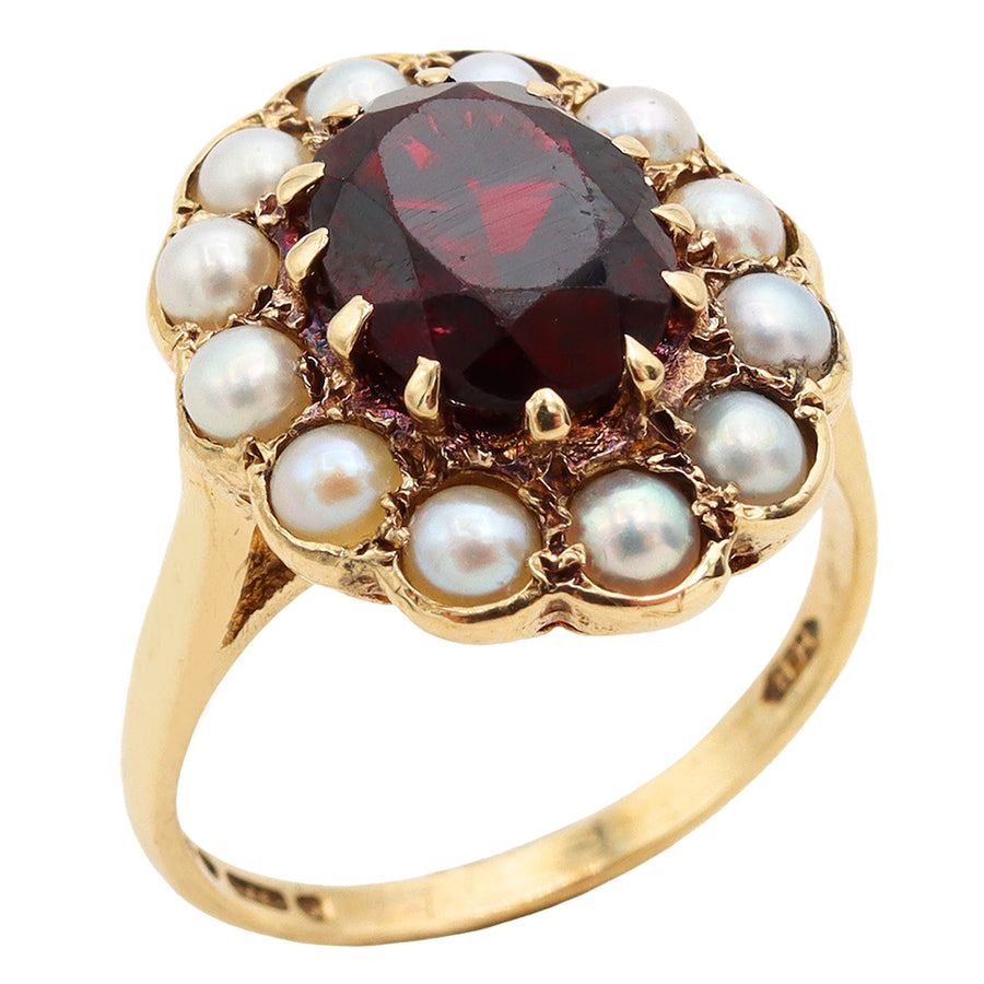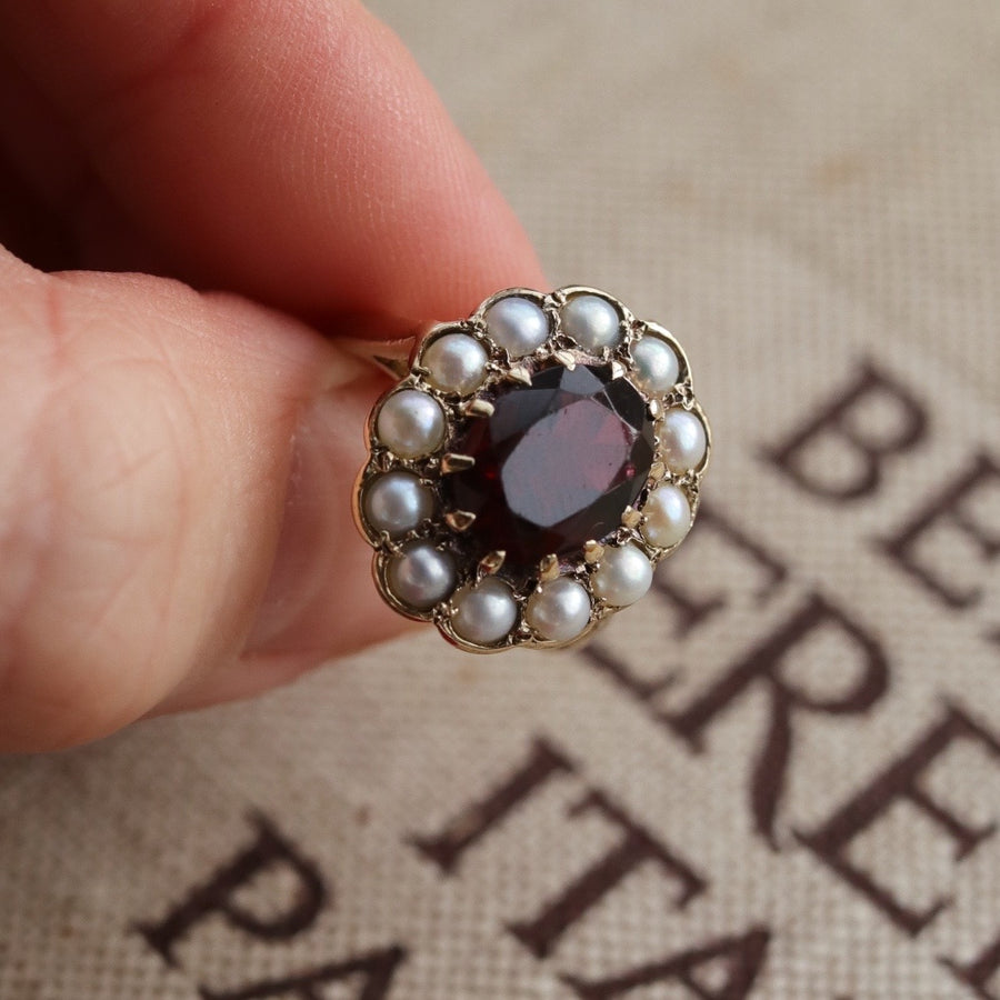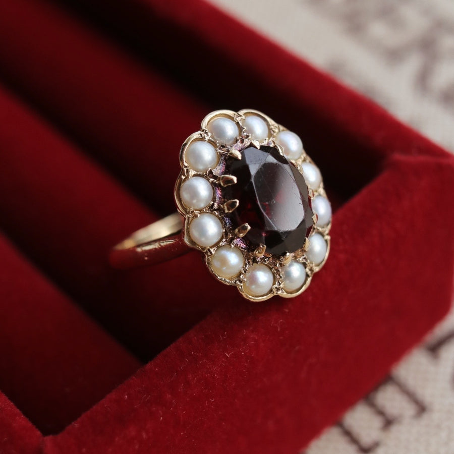 Magical unique 9ct gold statement cocktail ring with a blood red garnet centre surrounded by glistening pearl.