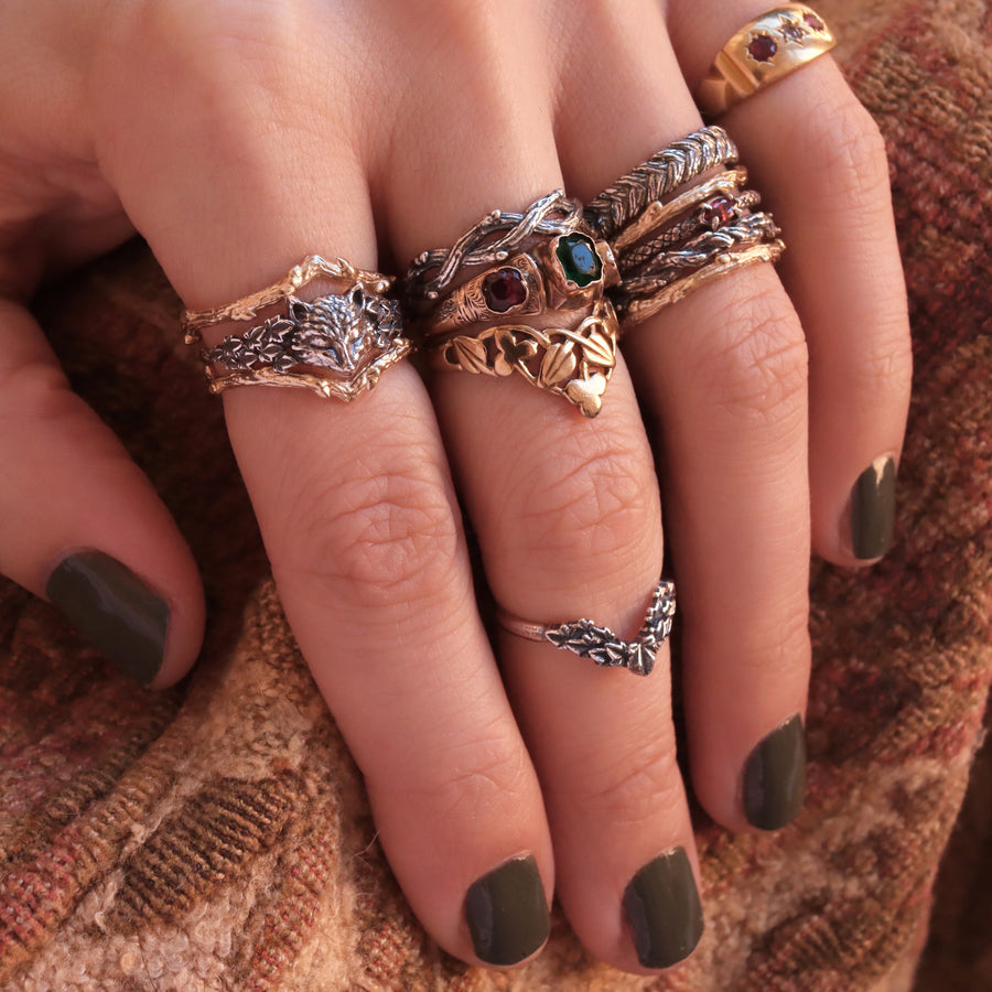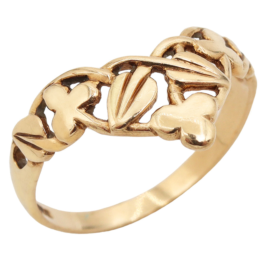 Magical unique 9ct Gold wishbone ring featuring delicate leaf and four leaf clover detail.